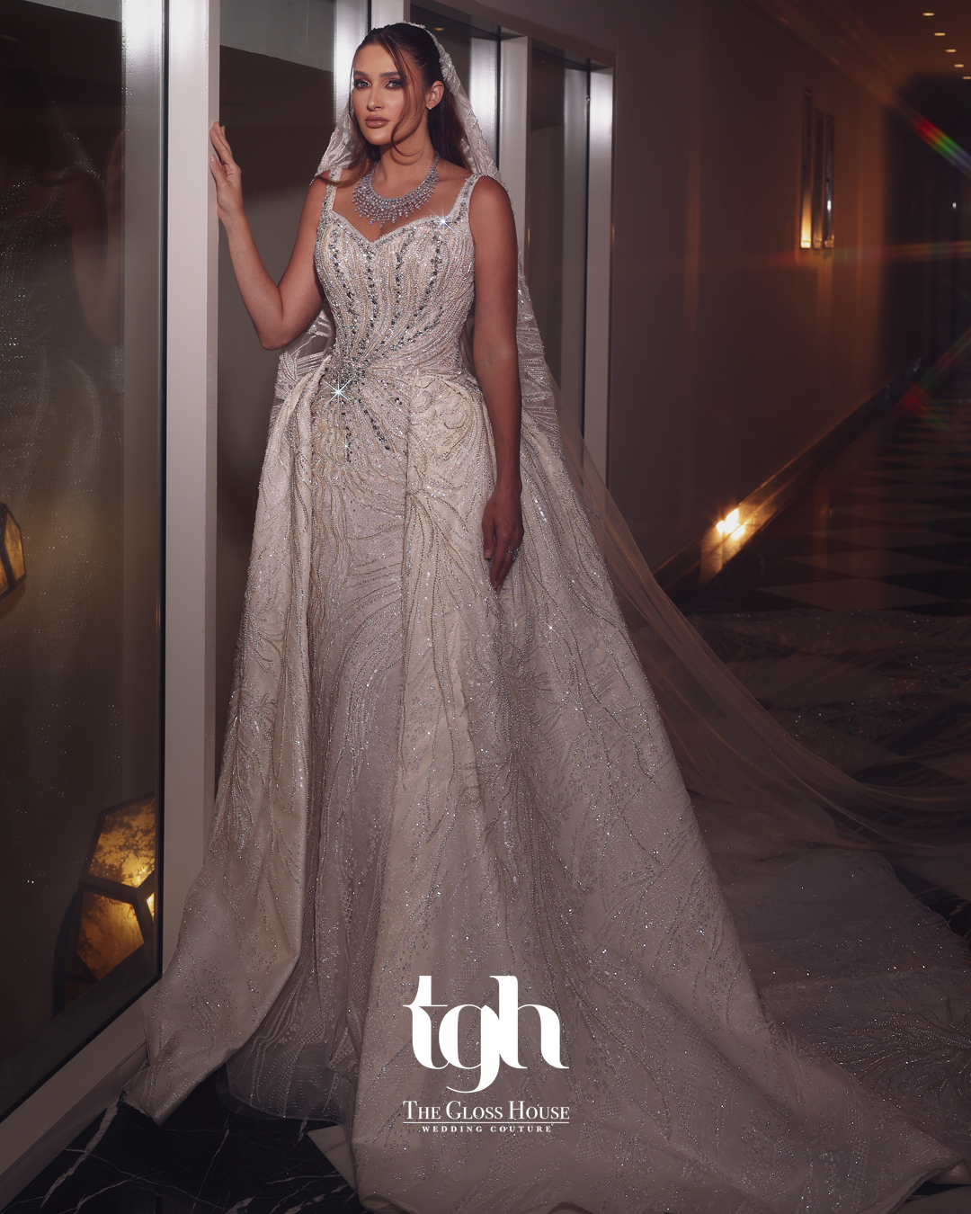 Sophisticated and alluring, Alyssa perfectly blends modern glamour with timeless elegance. This modern luxury mermaid gown with overskirt is adorned with crystals, beads, and pearls delicately placed over a champagne base, creating a luminous, soft radiance that enhances every curve. The dramatic overskirt and 1-meter train add movement and grandeur, making Alyssa the ideal choice for the bride who wants to captivate with both grace and brilliance.